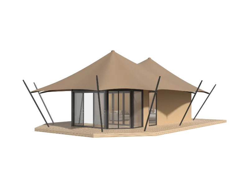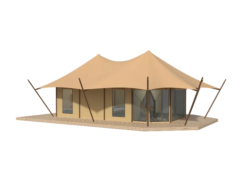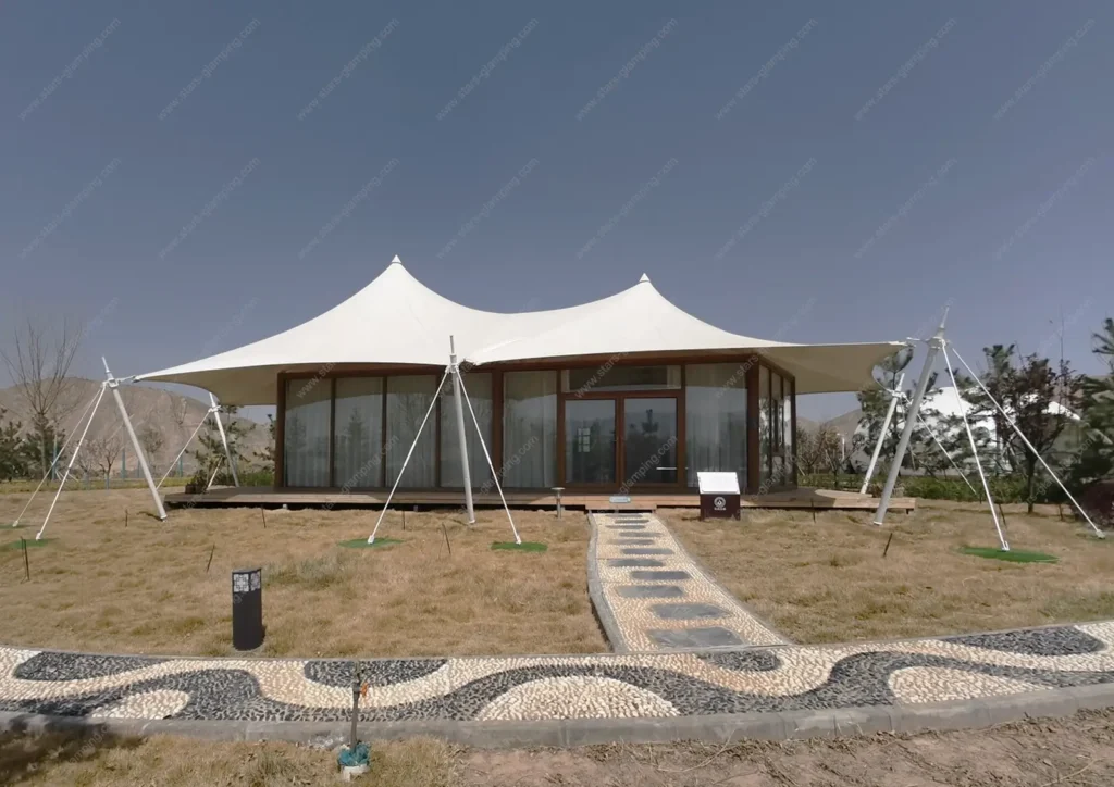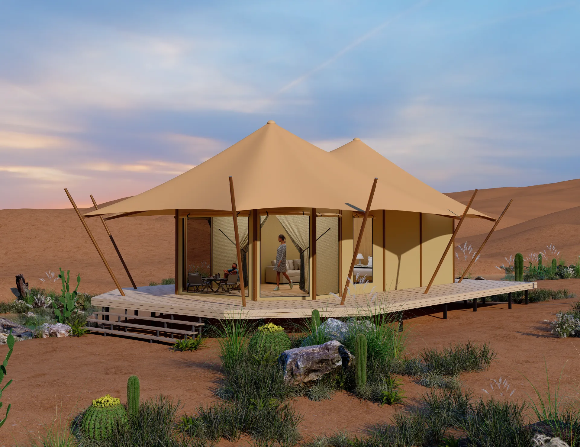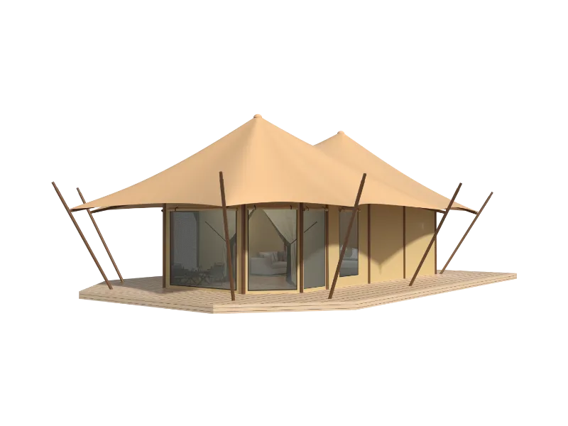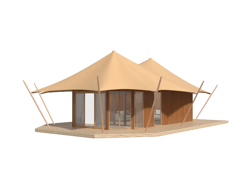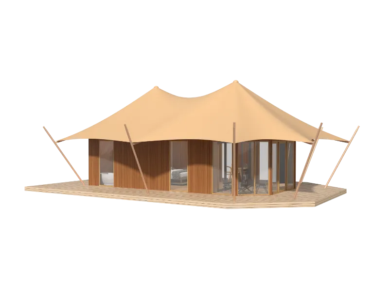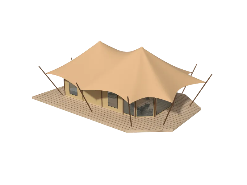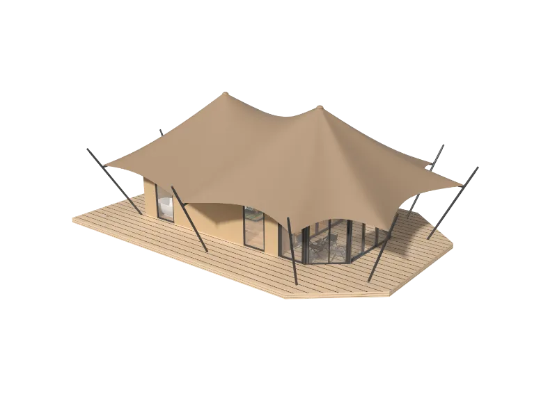 Our unique three-layer roof features an outer PVDF Architectural Membrane Fabric, a middle layer of PVC-Coated Polyester Fabric and an inner layer of decorative stretch fabric. The unique three-layer design ensures good thermal insulation. This spacious camping tent is made of durable waterproof canvas or canvas and wood to ensure comfort and protection in all weather conditions.