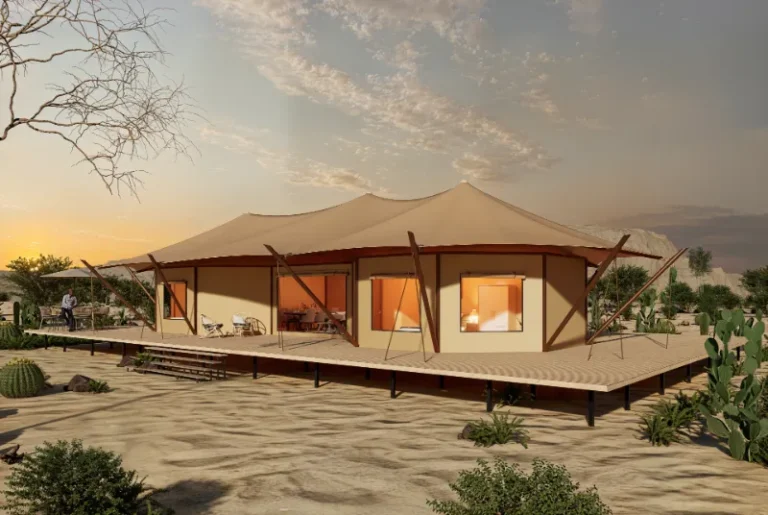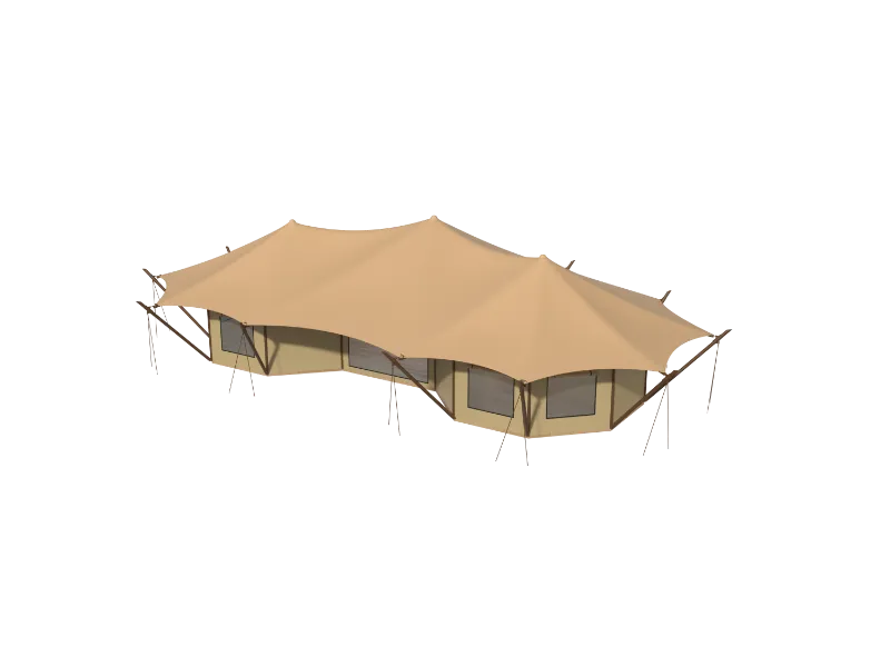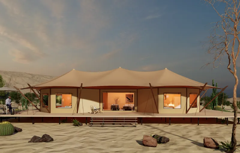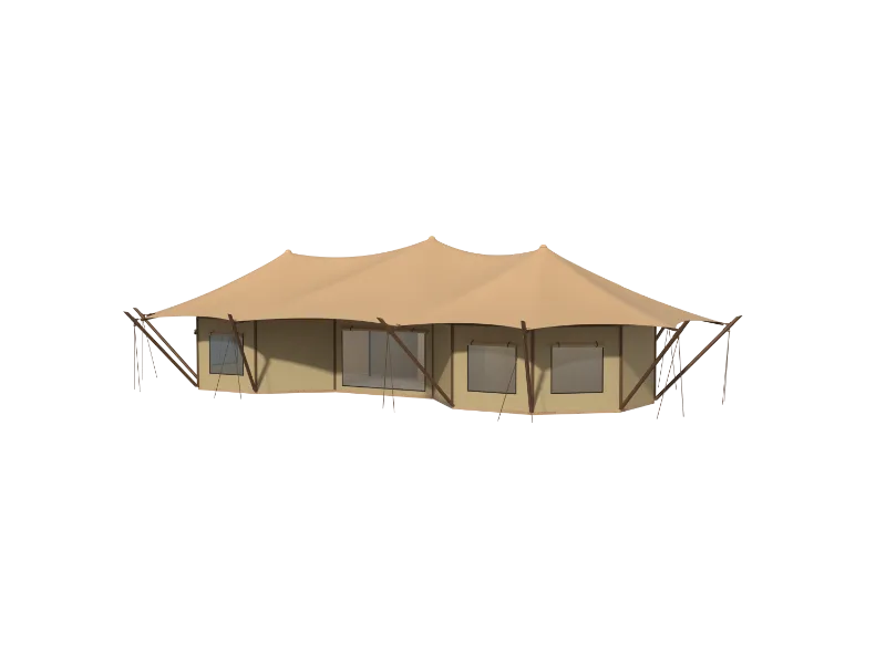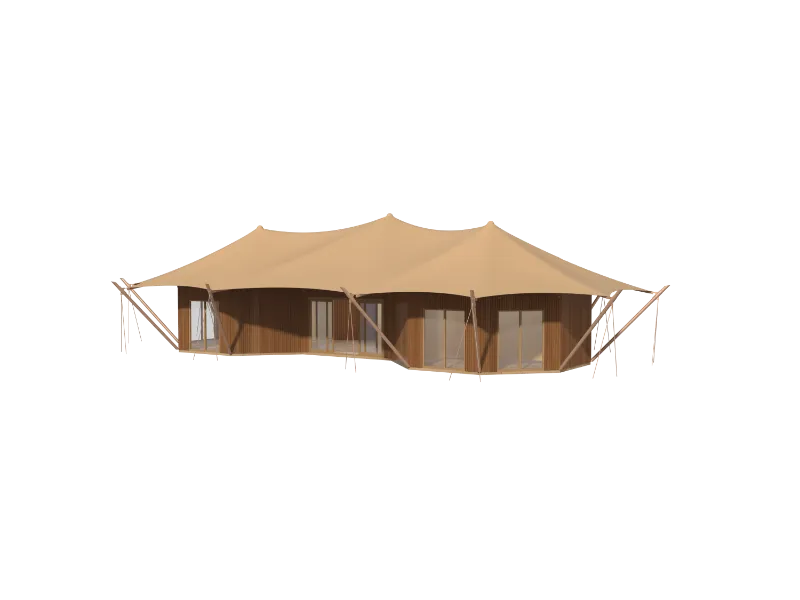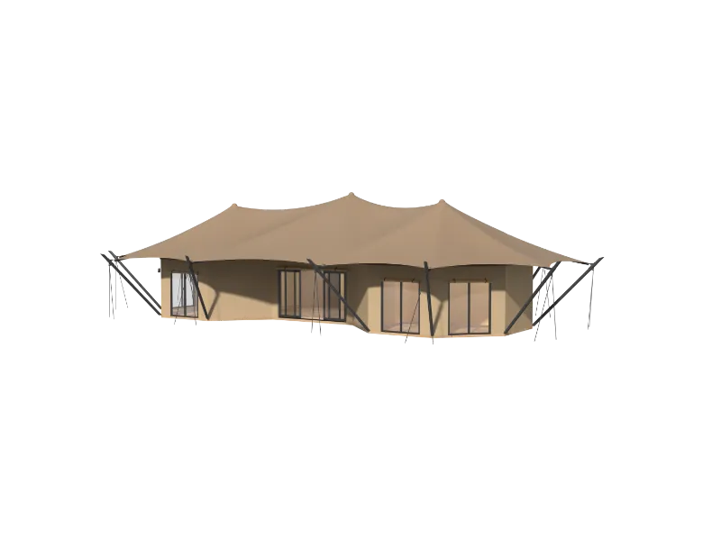 The overall frame uses 80x80mm galvanized steel pipe, which can withstand 12-level gale. The frame is galvanized surface treated for corrosion resistance and easy installation. The surrounding walls are templated wooden boards, which are cold-resistant and warm. The walls are covered with waterproof and flame-retardant Oxford canvas, which has natural windproof and breathability, and has excellent durability. It not only restores the natural style of the luxury tent, but also increases the elegant style inside the tent.