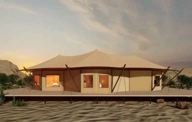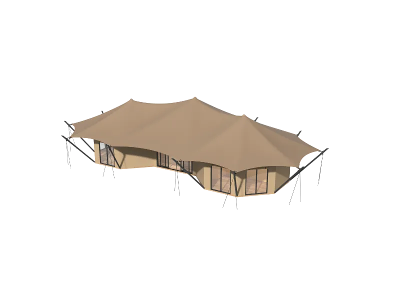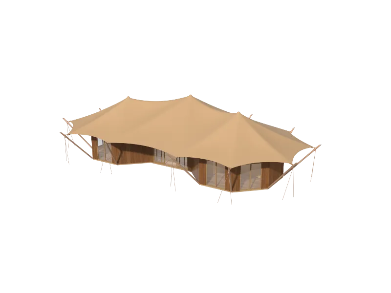 Lodge Tent- Rhea has a three-layer tarpaulin tensile membrane structure, which is sun-proof, heat-insulating and snow-proof. The high-quality waterproof and fire-proof PVDF membrane material has good self-cleaning ability and light transmittance. The second-layer PVC top cloth has anti-ultraviolet and dust-proof protection functions. The elastic cloth is the indoor ceiling, which increases the aesthetic appeal of the tent.