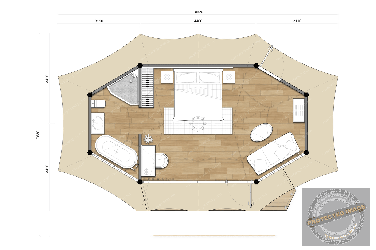 And the cover of glamping Luxury Tent – Uranus has a certain degree of light transmission, when the lights are on, the light through the soft top cloth, will emit a faint halo, extremely attractive.